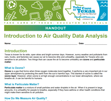 Student handout for the "Introduction to Air Quality" lesson plan. Understand the basics of air quality, discover the current air quality in an area, and learn about any necessary precautions.